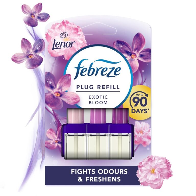 Febreze 3Volution Air Freshener Refills with Odourclear technology continuously fights tough lingering odours, leaving a light fresh scent for up to 90 days (if used 12 hours a day at minimum setting).Exotic Bloom fragrance is inspired by springtime natural freshness. Inspired by serene countryside, flowers and fruit-trees where blushes of peach blossom contrast with the floral brushstrokes of bewitching Rose de mai and Freesia. With normal plugs we get used to scents quickly, which means we eventually stop noticing the scent around us. Febreze 3Volution air fresheners solve this problem by continuously & automatically alternating every 45 minutes between 3 complementary, high quality scents, for a continuous fresh experience. Use the Febreze 3Volution refills only with Febreze 3Volution devices, sold separately, to fill your home with air freshness and fragrance that you will keep noticing day after day, week after week. And for instant freshness, try the full range of new Febreze products with the unique Odourclear technology, such as Febreze Fabric Refresher, Air and Car Freshener.