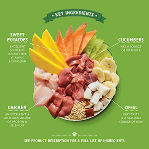 This Carnival Chicken supper is everything your doggy could ask for. Bursting with proper meat and wholesome vegetables that are steam cooked to help support gentle digestion, this grain-free recipe is made with sweet potatoes (a great source of dietary fibre, vitamin C and potassium) turmeric (known for its anti-inflammatory properties) and chicken (a delicious source of protein and selenium). Complete and balanced too. Not bad, hey? Dig in furry friends.